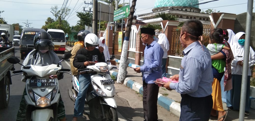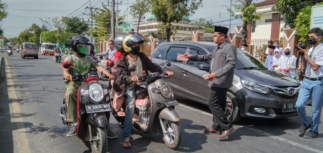 Tampak pada gambar juga dibantu oleh unsur siswa siswi MAN Sampang, yang juga sangat antusias membagikan masker kepada yang membutuhkan. (laporan Humas MAN Sampang)